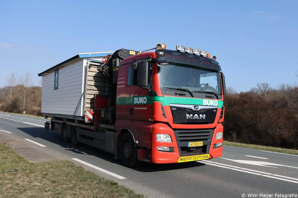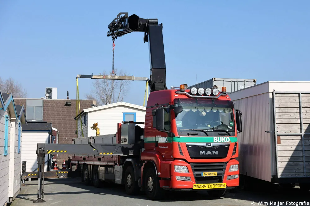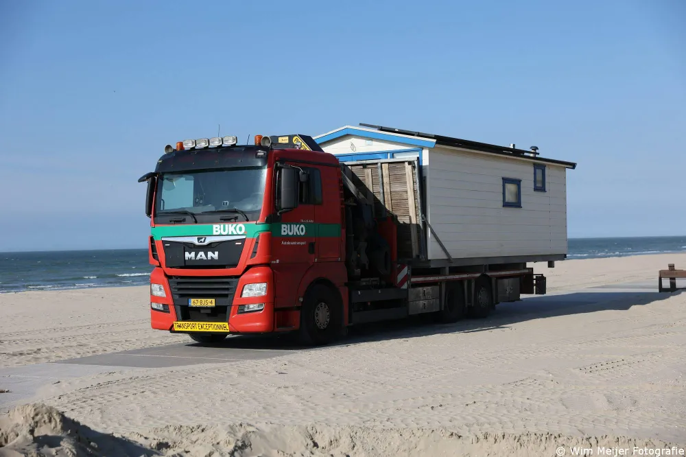 De eerste huisjes vanaf de winterstalling op transport naar strand Wijk aan Zee